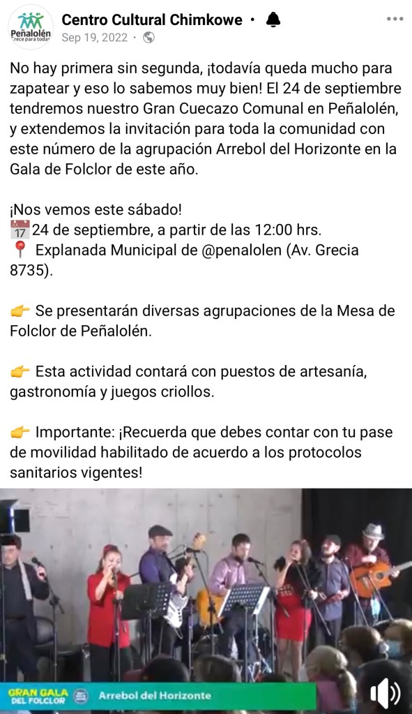 Presentación en vivo de un repertorio de cueca urbana con el conjunto de baile, para festivales, celebraciones comunitarias y eventos privados
